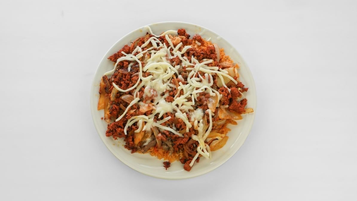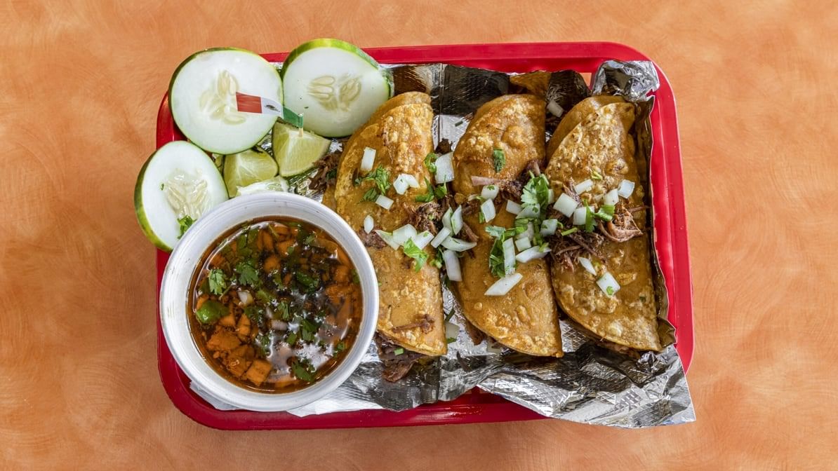 3 corn tortillas dipped in sauce, birria, cheese, consommé on side, onions and cilantro. With side of beans and rice