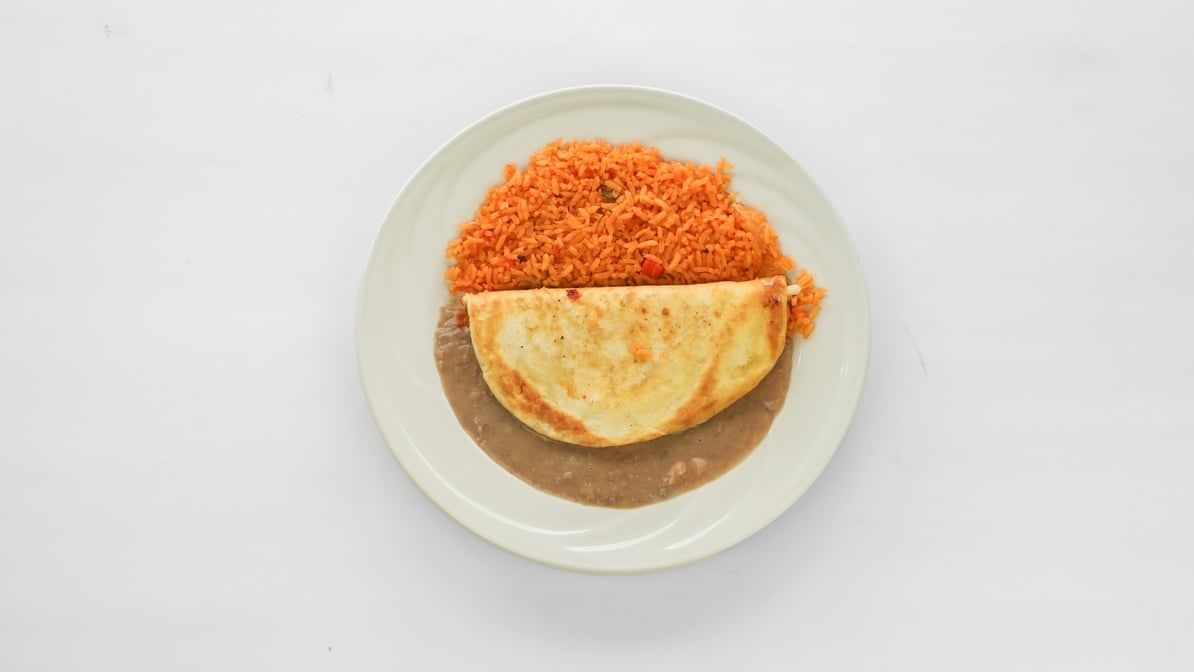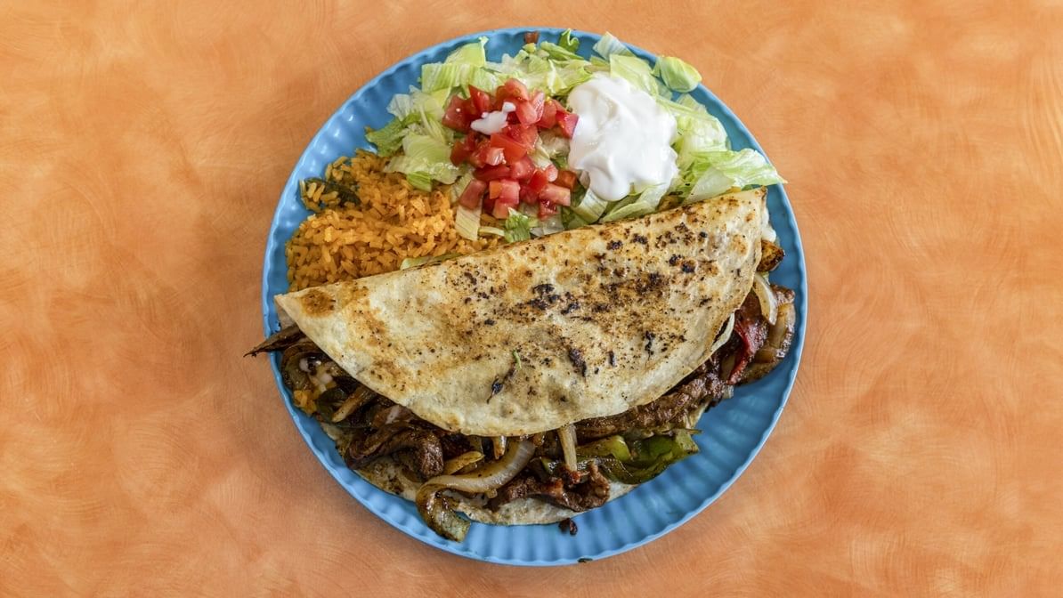 2 quesadillas with your choice of meat, beans & rice