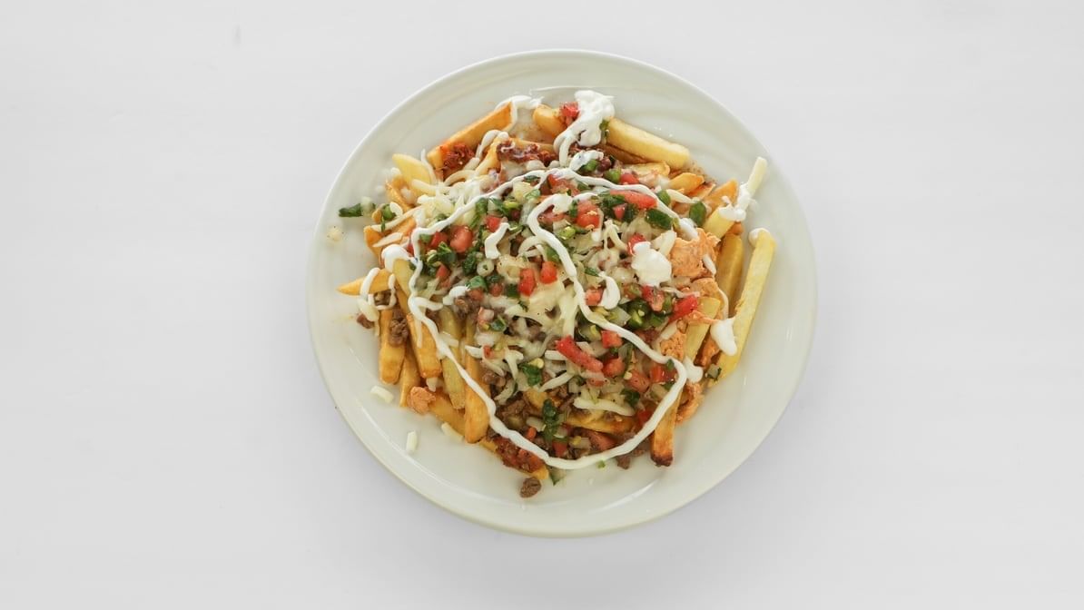 Jalapeño, cheese dip, cheese, steak chicken, pastor, chorizo, pico de gallo and fries