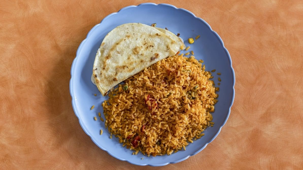 Flour tortilla filled with melted cheese, served with Mexican rice