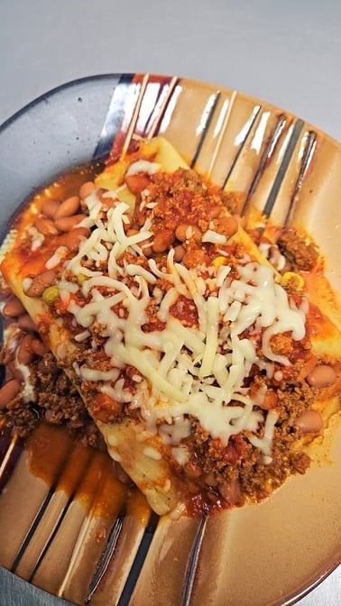 Tamale prepared with beans red ranchera sauce and topped with ground beef and cheese
