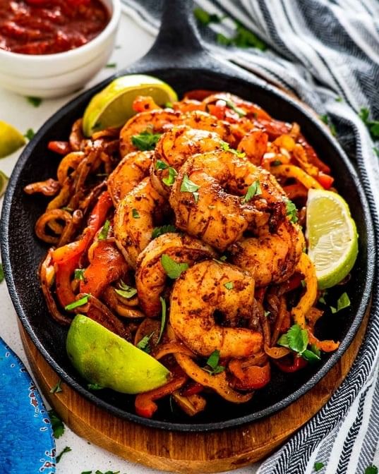 Shrimp fajitas with grilled onions, peppers, and tomatoes. With a side of rice and beans, salsa, and tortillas