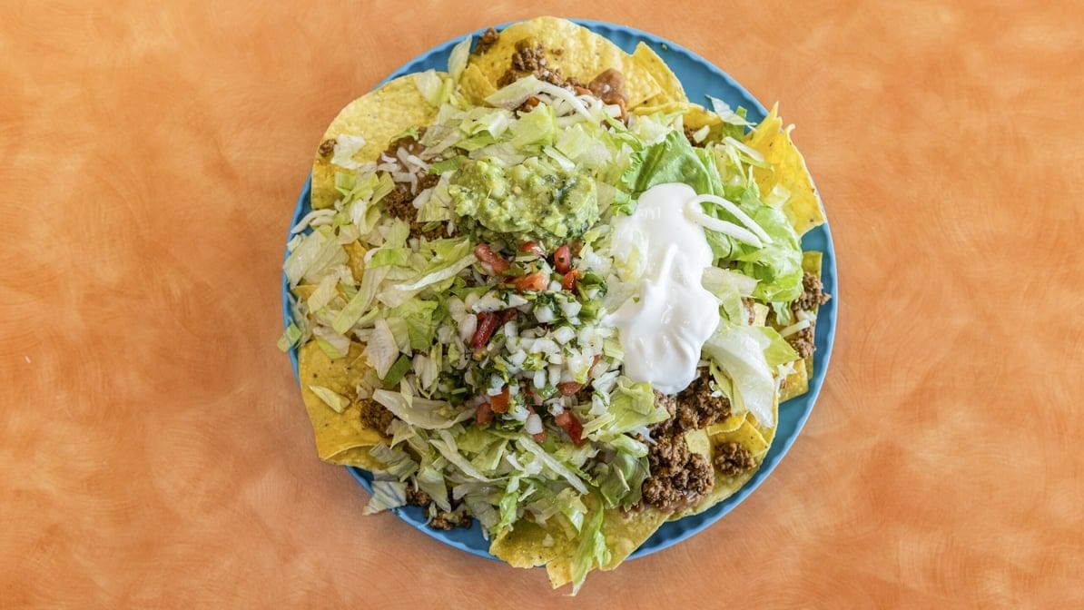 Ground beef, frijoles, guacamole, sour cream, pico de gallo, jalapeños and cheese