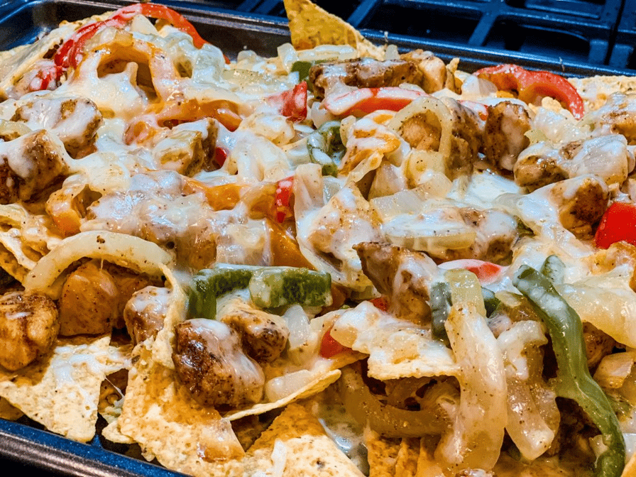 Grilled peppers, grilled onions & tomatoes, cheese fries and your choice of chicken or steak