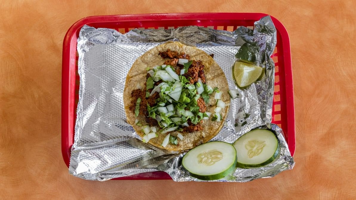 Meat, onion, cilantro on a corn tortilla