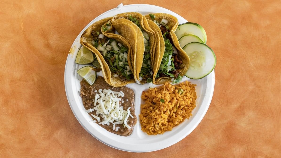 3 tacos with rice and beans and your choice of meat
