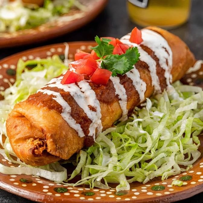 Ground beef topped with cheese dip in a deep fried flour tortilla, served with rice, beans and salad