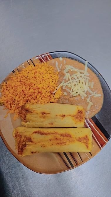 2 tamales with rice and beans.