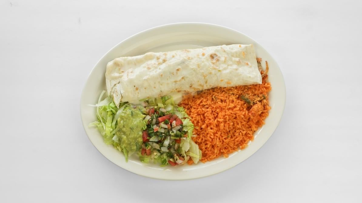 Meat, flour tortilla, cheese dip, beans, rice, lettuce, guacamole, pico de gallo and sour cream
