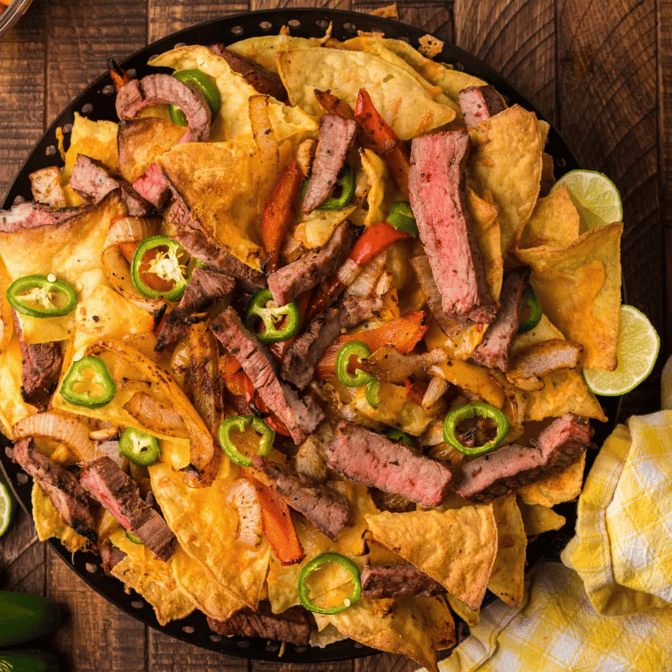 Jalapeños, beans, sour cream, pico de gallo, cheese dip , cheese with steak, chicken, pastor and chorizo