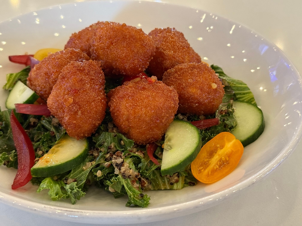 Crisp greens and garden herbs served with cucumber chili dressing. Topped with pickled red onion, cucumbers, heirloom tomatoes, sliced almonds, and sweet chili fried chicken.