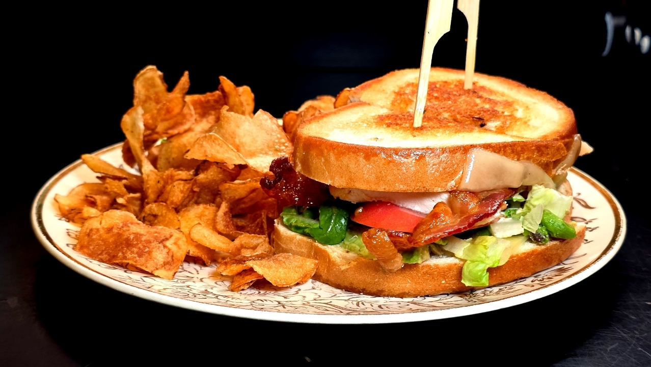 Grilled chicken breast, bacon, avocado, lettuce, tomato, pink garlic aioli, melted Gruyère on sourdough