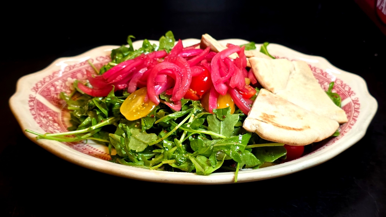 Whipped feta cheese topped with arugula, pickled onions, and heirloom cherry tomatoes. Served with lemon vinaigrette and warm bread.